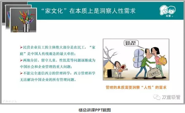 “雙童”樓仲平答:“雙童”之所以注重“家文化”,也是基于洞察人性的需求。從“人性”的角度來(lái)說(shuō),站在員工的角度進(jìn)行換位思考,給員工解決兩地分居、留守兒童、農(nóng)民工性饑荒等后顧之憂,員工一定會(huì)以更長(zhǎng)遠(yuǎn)的角度來(lái)看待自己的工作,來(lái)理解自己與企業(yè)之間的關(guān)系。