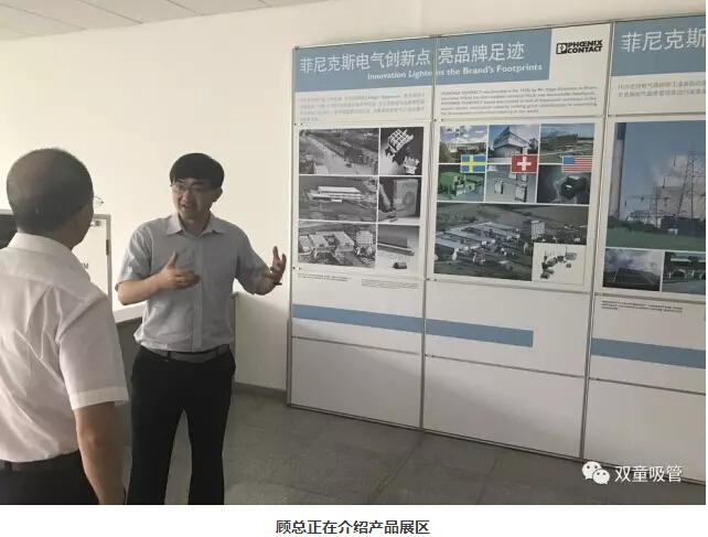 在顧總的帶領(lǐng)下,“雙童”樓仲平和李二橋參觀了菲尼克斯的文化展區(qū)和產(chǎn)品展區(qū)。并在此過程中,顧總詳盡地向二位介紹了菲尼克斯在中國的創(chuàng)始過程、中國市場的開拓以及菲尼克斯在全球的產(chǎn)業(yè)分布。