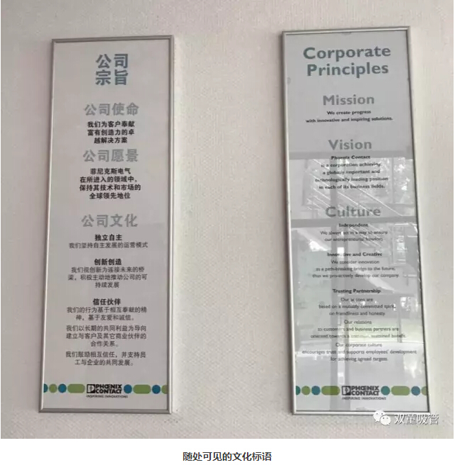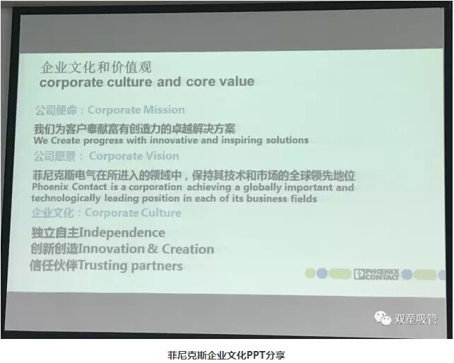 通過PPT介紹,我們了解到菲尼克斯獨特的企業(yè)文化價值觀,秉承“獨立自主、創(chuàng)新創(chuàng)造和信任伙伴”的企業(yè)文化,經(jīng)過中國公司二十三年的歲月沉淀,融入了中國優(yōu)秀的傳統(tǒng)文化和中國團隊的智慧,中西合璧、兼收并蓄。我們發(fā)現(xiàn),菲尼克斯的企業(yè)文化價值觀與“雙童”高度趨同: