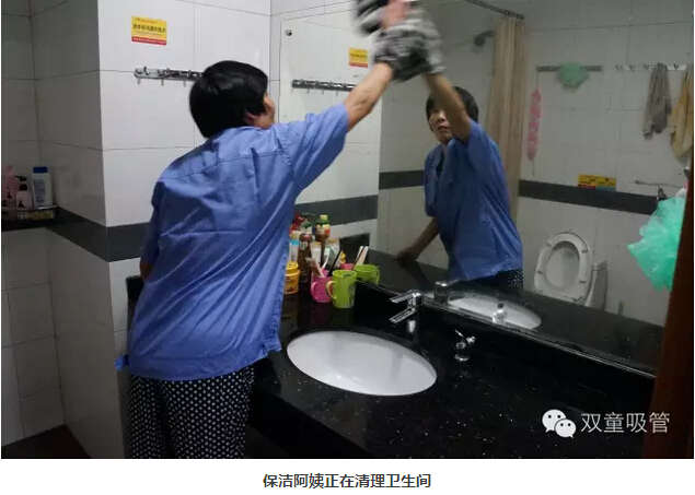 首先吸管妞就從衛(wèi)生保潔工作說起,每天清晨,保潔阿姨就已經(jīng)將員工寢室的通道打掃地干干凈凈了。墻面上的每一塊瓷磚都得用布拖把擦拭干凈,不能留下一點灰塵!