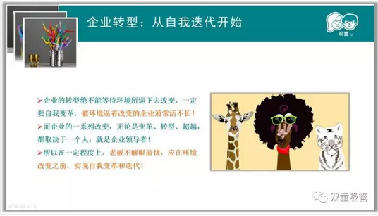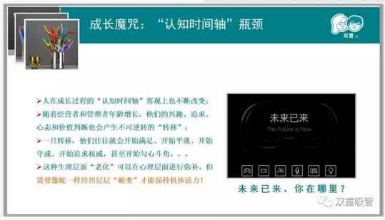 其實,經(jīng)理人老化更多所指是心理層面的“老化”,而人的心理年齡是可以通過推動、學習、認知而改變的,而領導者的責任就是要推動經(jīng)理人“逆生長”。“雙童”在每周一和周三的19-21點,舉辦全體員工的學習會,確保所有員工每月有累計8小時的學習和培訓;將員工的學習與職業(yè)升遷掛鉤,讓每個員工不斷學習和認知到新事物。