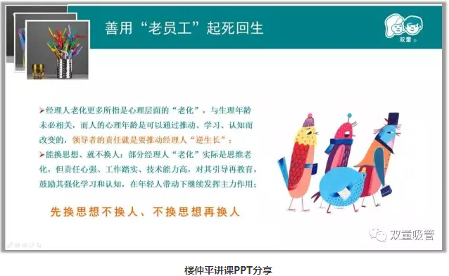通過樓仲平個人的迭代,也促進了“雙童”團隊的蛻變,推動團隊向年輕化、知識化和信息化轉(zhuǎn)變。2011年9月,“雙童”發(fā)布了第二個《企業(yè)五年發(fā)展規(guī)劃》,明確“再造經(jīng)理人”計劃,明確領導層更替:選拔培養(yǎng)年輕領導層、重要崗位領導年輕化、明確實施股份制改革,慢慢解決管理層老化問題!重組后的“雙童”團隊平均年齡不到三十歲,大部分核心團隊的工齡在十年以上,學歷、知識層次和忠誠度大幅提高!