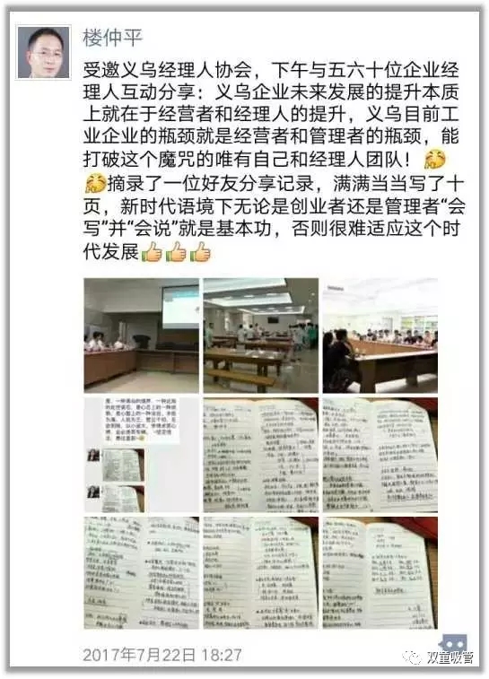 很多企業(yè)都會存在企業(yè)經(jīng)理人團隊“老化”的問題,其實這種“老化”的本身不在于生理層面的年齡問題,而在于心理層面出現(xiàn)的“老化”問題…… 這不,近日,義烏市企業(yè)經(jīng)理人協(xié)會的60余位職業(yè)經(jīng)理人也就此話題專程來到“雙童”參觀交流,開展《未來經(jīng)理人成長計劃》第三期線下學習活動,“雙童”樓仲平也受邀參與此次活動。