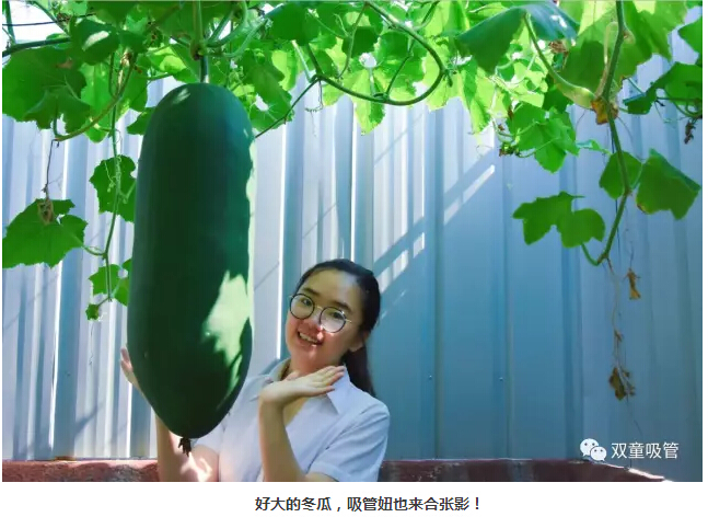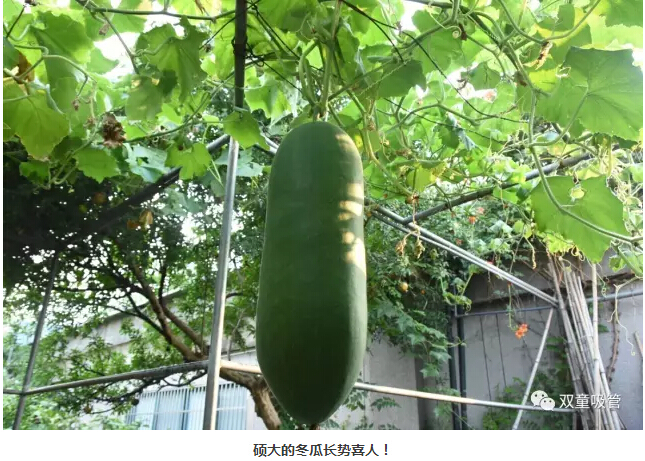 瞧!這冬瓜長得“五大三粗”都快壓彎了枝架,這么大的冬瓜大家都爭著和它合影呢!看來,咱們的“雙童”吃貨們又有福啦!