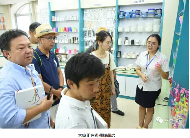 既然到“雙童”參觀,產(chǎn)品自然也是日本客人們重點關(guān)注的方面之一!當(dāng)他們到樣品房看到“雙童”琳瑯滿目的創(chuàng)新吸管時,都對“雙童”的研發(fā)能力十分驚訝,甚至當(dāng)即要求購買一些創(chuàng)新產(chǎn)品帶回日本作為紀(jì)念。