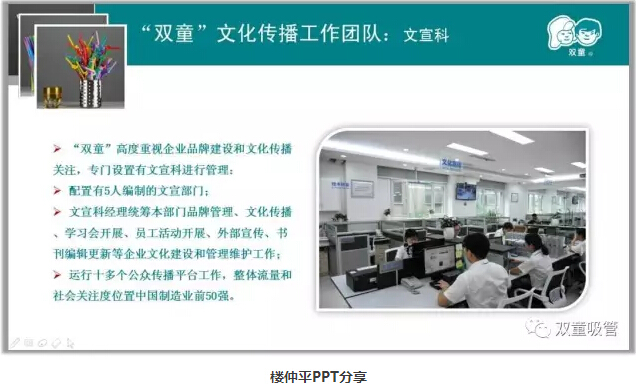 在互聯(lián)網(wǎng)時代背景下,傳統(tǒng)的廣告營銷和品牌推廣逐漸被新的互聯(lián)網(wǎng)新媒體和自媒體所替代。“雙童”高度重視企業(yè)的自媒體傳播,專門設(shè)置有5人編制的文宣部門,負(fù)責(zé)運(yùn)營微博、微信、官方網(wǎng)站等十幾個自媒體應(yīng)用平臺,整體流量和社會關(guān)注度位置中國制造業(yè)前20強(qiáng)!