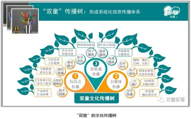 “左邊是閃亮點(diǎn)的傳播介紹,包括了綠色制造、節(jié)能降耗、精細(xì)化管理以及技術(shù)創(chuàng)新等內(nèi)容。右邊通過微博、微信、博客、官網(wǎng)、百科等制造話題,即時發(fā)布博文、軟文、帖子等內(nèi)容,并進(jìn)行互聯(lián)網(wǎng)、IT推廣、展位推廣等自媒體的傳播。上邊則是政府、媒體關(guān)注的價值觀傳播。三大部分組成了‘雙童’的文化傳播樹!”