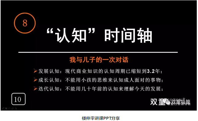 “認(rèn)知”時間軸:“雙童”樓仲平通過自己與兒子的一次對話認(rèn)知到不能用慣性思維來認(rèn)知我們的下一代。樓仲平的成長也伴隨著不斷的否定,在認(rèn)知、糾錯、不斷改變下實(shí)現(xiàn)自我成長。“創(chuàng)業(yè)者”最應(yīng)該有“時間軸”的概念,需要擁有自我蛻變的能力,否則你就很難成長!