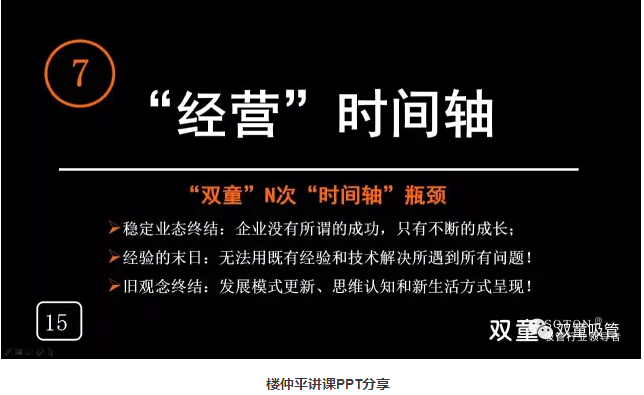 “經(jīng)營”時間軸:樓仲平也用“雙童”的發(fā)展史告訴大家經(jīng)營也是有時間軸的,會遇到瓶頸和“天花板”。企業(yè)沒有所謂的成功,只有不斷的成長,我們無法用既有經(jīng)驗(yàn)和技術(shù)解決所遇到所有問題!