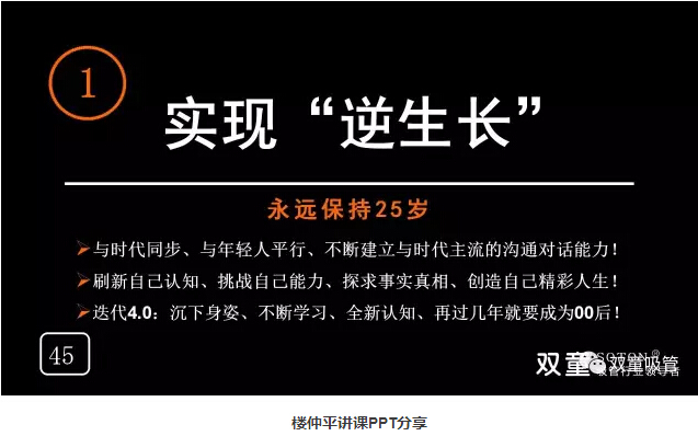 實(shí)現(xiàn)“逆生長”:“雙童”樓仲平通過不斷的到各地演講寫課件鍛煉自己,嘗試新的突破,喜歡挑戰(zhàn)新的東西,永遠(yuǎn)將自己定位在25歲,不斷學(xué)習(xí)去認(rèn)知新的世界,去擁抱這個高速變化的世界,從而影響團(tuán)隊(duì)并保持“雙童”不被淘汰。最后,樓總也鼓勵在座的企業(yè)主們不能老去,要與時代保持同步,接受不斷變化和挑戰(zhàn),迎合這個高度變化的世界!