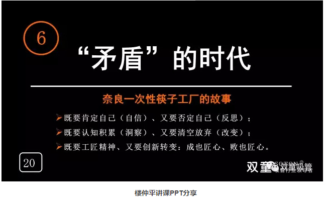 “矛盾”的時(shí)代:“雙童”樓仲平通過日本奈良一次性筷子的故事告訴大家成也工匠精神、敗也工匠精神,沒有改變,“工匠”精神也沒有用。作為創(chuàng)業(yè)者來講,我們不能用過往的經(jīng)驗(yàn)來理解發(fā)生的一切,否則你會(huì)被時(shí)代所拋棄。在不同的時(shí)代,你對(duì)時(shí)間和技術(shù)進(jìn)步的理解是不一樣的,既要肯定自己、又要否定自己;既要認(rèn)知積累、又要清空放棄;既要工匠精神、又要?jiǎng)?chuàng)新轉(zhuǎn)變!