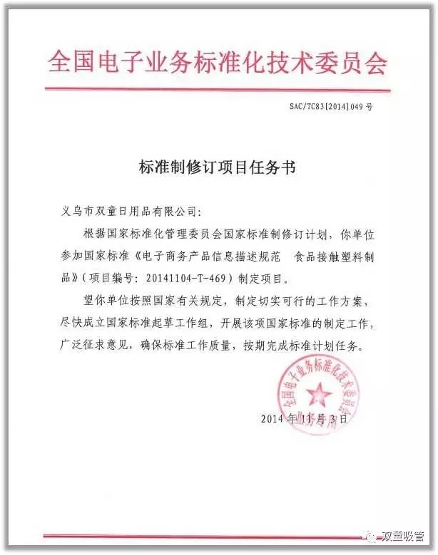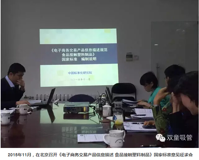 2014年11月3日,由“雙童”主導(dǎo)起草的《電子商務(wù)交易產(chǎn)品信息描述 食品接觸塑料制品》國(guó)家標(biāo)準(zhǔn)正式立項(xiàng),并于2016年3月于北京通過(guò)專家評(píng)審,2017年正式發(fā)布,標(biāo)準(zhǔn)號(hào)GB/T 33986-2017,該標(biāo)準(zhǔn)的發(fā)布實(shí)施,標(biāo)志著“雙童”在標(biāo)準(zhǔn)戰(zhàn)略工作中由起草單一的產(chǎn)品技術(shù)標(biāo)準(zhǔn)向系統(tǒng)的信息應(yīng)用標(biāo)準(zhǔn)轉(zhuǎn)變,為中小企業(yè)參加國(guó)家標(biāo)準(zhǔn)的起草工作樹(shù)立了一個(gè)新的方向。