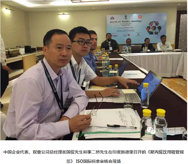 2015年10月,雙童公司代表中國(guó)企業(yè)派出了六人代表團(tuán)在印度新德里召開(kāi)的《聚丙烯飲用吸管規(guī)范》 ISO國(guó)際標(biāo)準(zhǔn)審核會(huì)議