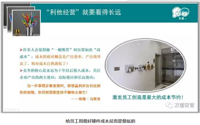 實際上,一說到建設廠房,大部分企業(yè)都會追求低成本,用最普通的材料,給員工使用的硬件能省則省。十幾年下來,廠房破破爛爛、東補西補,員工不珍惜,隨之帶來的就是破窗效應。所以,建設這樣一座高標準的“五星級工廠”在當時是絕大部分企業(yè)所不能理解的!“雙童”樓仲平曾在《當一個幸福的老板》一文中寫道: