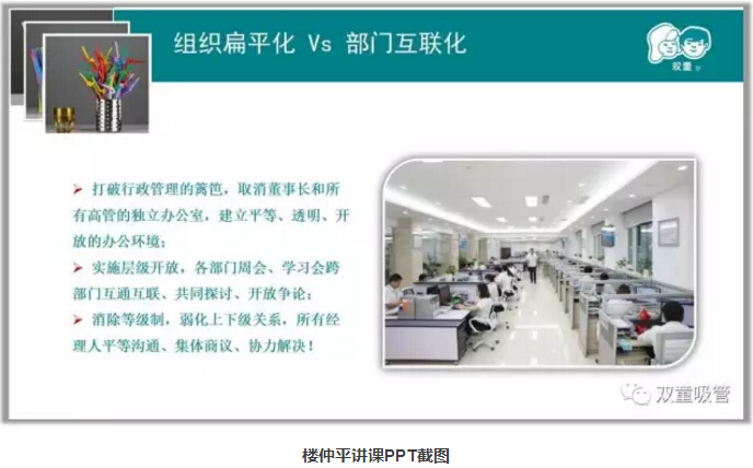 通過部門互聯(lián)化和組織扁平化,讓“雙童”實現(xiàn)了層級開放,讓各部門能夠跨部門互通互聯(lián),有效溝通,同時,有效地弱化了上下級關(guān)系,促使所有員工平等溝通、集體商議、協(xié)力解決,促進企業(yè)高效運轉(zhuǎn)!親,你明白了嗎?