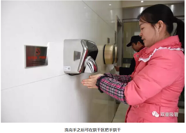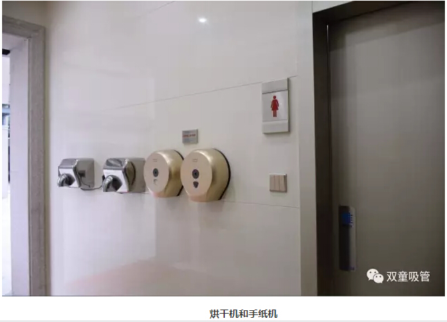 “雙童”每個洗手間的格局分明,除了男女衛(wèi)生間外,還設(shè)置了洗手區(qū)、烘干區(qū)、手紙區(qū),配置十分齊全。進入衛(wèi)生間前,員工可以在手紙區(qū)取紙巾。洗手后,還可以用烘干機把手烘干。
