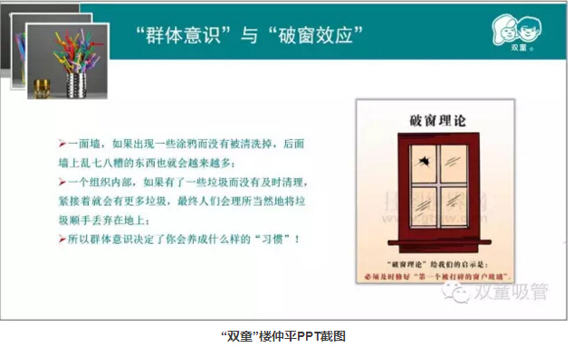個體習慣依附于“群體意識”,環(huán)境會潛移默化地影響員工的素養(yǎng),環(huán)境不好則會產(chǎn)生破窗效應(yīng)。比如一個素養(yǎng)再差的農(nóng)民工,到了“雙童”這樣好的企業(yè)環(huán)境中工作和生活,習慣也會慢慢變好,整體素養(yǎng)也會得到有效提升。