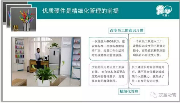 而優(yōu)質(zhì)硬件是精細化管理的前提,所以我們給員工使用五星級洗手間并不是有錢沒地花,而是給員工用五星級的硬件,引導員工改變自身的思維和行為方式,讓員工關(guān)注細節(jié)!“雙童”廁所革命的背后是“雙童”品質(zhì)追求的“人心和良心”,唯有員工的思想轉(zhuǎn)變了,生產(chǎn)的產(chǎn)品才能讓客戶放心!親,你們明白了嗎?