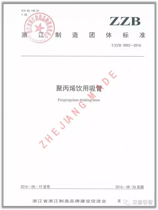 2016年4月28日,《聚丙烯飲用吸管》浙江制造團(tuán)體標(biāo)準(zhǔn)正式立項(xiàng),并由“雙童”承擔(dān)編制起草工作。2016年8月26日,《聚丙烯飲用吸管》浙江制造團(tuán)體標(biāo)準(zhǔn)正式發(fā)布實(shí)施?!半p童”成為了吸管行業(yè)首家通過產(chǎn)品認(rèn)證的企業(yè)。這標(biāo)志著“雙童”產(chǎn)品質(zhì)量達(dá)到國內(nèi)一流、國際先進(jìn)又一強(qiáng)有力證明,為推動浙江制造品牌建設(shè)起到了良好的推動及帶頭作用。