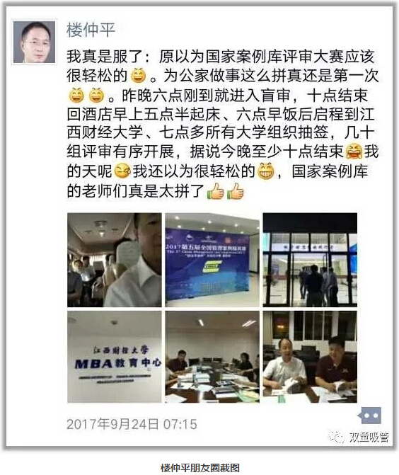 樓仲平在比賽前一晚抵達江西財經(jīng)大學后,就投入到緊張的工作當中,對16支半決賽的隊伍進行盲審,直至晚上10點才結束工作。第二天一大早,所有評委老師5點半就起床,六點用完早餐就啟程前往江西財經(jīng)大學開展一天的工作。高強度的工作也讓樓仲平刷新了對此次大賽的認知,在朋友圈直言“沒想到老師們也這么拼”!