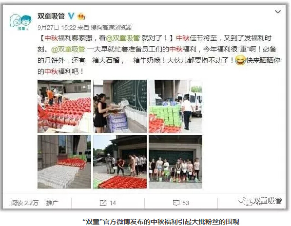中秋佳節(jié)將至,又到了發(fā)福利時(shí)刻。前兩天,“雙童”的官方微博發(fā)布了“雙童”人領(lǐng)福利的動(dòng)態(tài),引發(fā)了各路網(wǎng)友羨慕嫉妒恨。看來,“雙童”的中秋福利還是很不錯(cuò)滴,下面,吸管妞就帶大家來看看吧!
