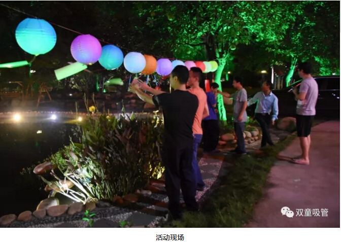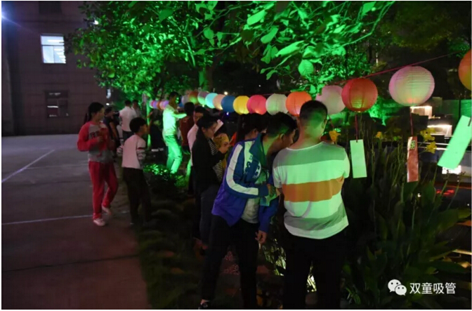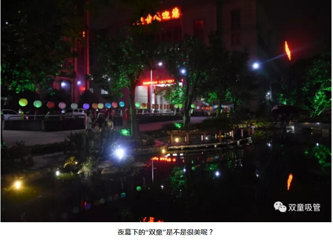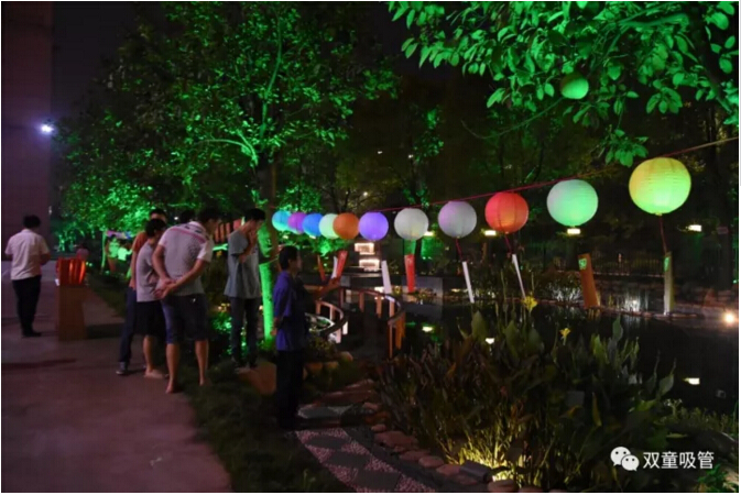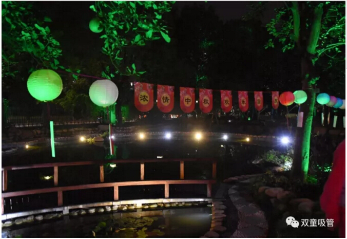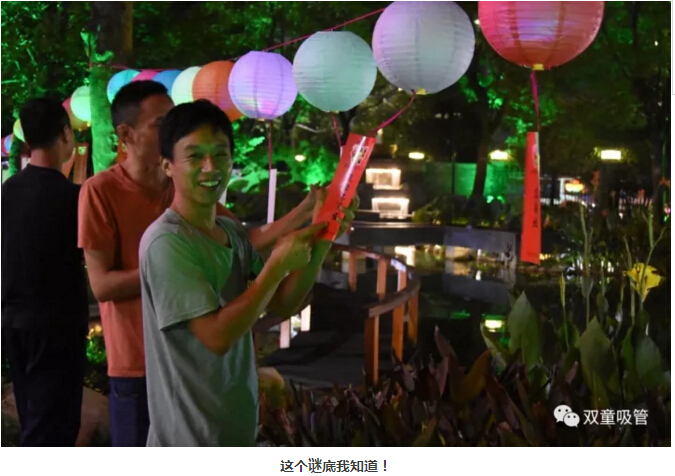 瞧,一排排燈籠掛在中水景觀池邊烘托出了濃郁的節(jié)日氛圍,夜色初上,朦朦朧朧的淡淡燈光,與月色交相輝映,夜幕下的“雙童”美麗極了!我們的燈謎競猜大會(huì)也在濃厚的節(jié)日氛圍中拉開帷幕……