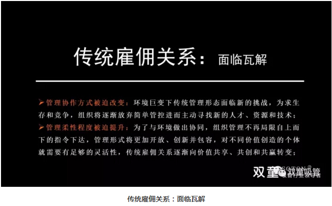 在新時(shí)代背景下,管理進(jìn)入了信息管理時(shí)代,組織管理逐漸扁平化,員工管理逐漸互聯(lián)化,員工與組織形成共生關(guān)系。通過這樣的轉(zhuǎn)變,傳統(tǒng)雇傭關(guān)系面臨瓦解,管理協(xié)作方式被迫改變,組織將逐漸放棄簡單管控進(jìn)而主動(dòng)尋找新的人才、資源和技術(shù)。管理形式也將更加開放、創(chuàng)新并包容,對不同價(jià)值創(chuàng)造的個(gè)體就需要有足夠的靈活性,傳統(tǒng)雇傭關(guān)系逐漸向價(jià)值共享、共創(chuàng)和共贏轉(zhuǎn)變!