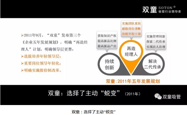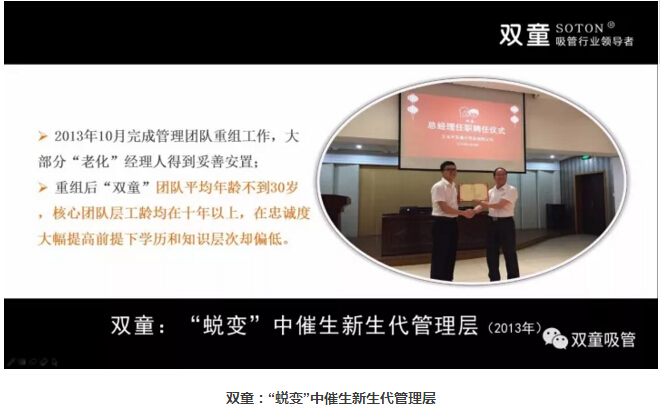 面對這樣的現(xiàn)狀,“雙童”選擇了主動(dòng)“蛻變”,在2011年發(fā)布了第三個(gè)《企業(yè)五年發(fā)展規(guī)劃》,明 確“再造經(jīng)理人”計(jì)劃,明確領(lǐng)導(dǎo)層更替:選拔培養(yǎng)年輕領(lǐng)導(dǎo)層、重要崗位領(lǐng)導(dǎo)年輕化、明確實(shí)施股份制改革,慢慢解決管理層老化問題!重組后的“雙童”團(tuán)隊(duì)平均年齡不到三十歲,大部分核心團(tuán)隊(duì)的工齡在十年以上,學(xué)歷、知識層次和忠誠度大幅提高!