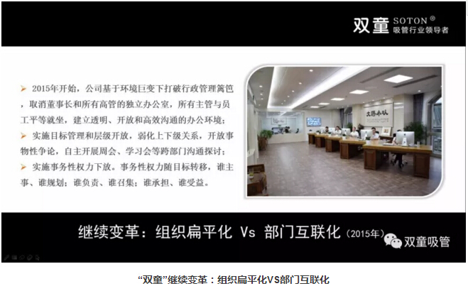 基于時(shí)代的改變和挑戰(zhàn),“雙童”在2015年對組織形式做出新的變革,打破行政管理籬笆,通過平等、透明、開放的辦公環(huán)境,消除部門之間的隔閡,實(shí)施目標(biāo)管理和層級開放,弱化上下級關(guān)系,自主開展周會(huì)等跨部門溝通探討,提升部門工作效率。同時(shí),實(shí)施事務(wù)性權(quán)力下放,大家以解決事務(wù)為核心,讓權(quán)力隨事務(wù)轉(zhuǎn)移,誰主事、誰規(guī)劃;誰負(fù)責(zé)、誰召集;誰承擔(dān)、誰受益,一切以工作結(jié)果為導(dǎo)向,也實(shí)現(xiàn)了跨部門互通互聯(lián)、共同探討!