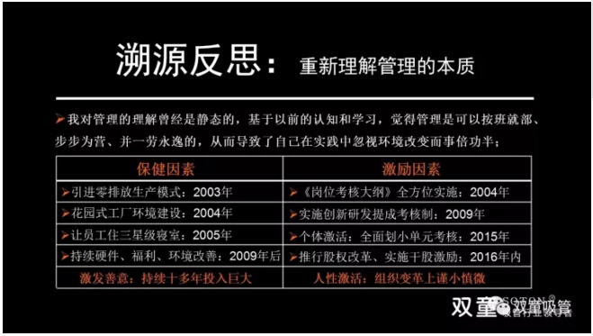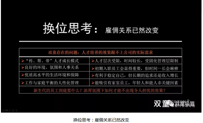 “雙童”經(jīng)歷團(tuán)隊(duì)“蛻變”后,通過學(xué)習(xí)會(huì)意識引導(dǎo)、推動(dòng)家文化人性管理以及全方位改善員工的生活生產(chǎn)環(huán)境,提升團(tuán)隊(duì)認(rèn)知意識和凝聚力!經(jīng)歷“蛻變” 后團(tuán)隊(duì)凝聚力確實(shí)有所提升,但客觀上基層員工的流動(dòng)性依然較大,對高端人才引進(jìn)還是沒有太大吸引力,企業(yè)的持續(xù)發(fā)展明顯存在著天花板瓶頸。