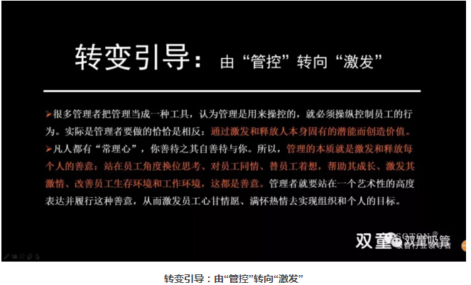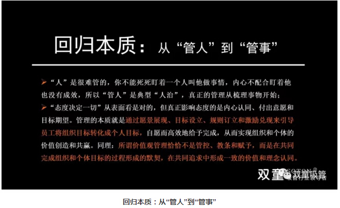 管理的本質(zhì)是“管事”而非“管人”,通過愿景展現(xiàn)、目標(biāo)設(shè)立、規(guī)則訂立和激勵(lì)兌現(xiàn)來引導(dǎo)員工將組織目標(biāo)轉(zhuǎn)化成個(gè)人目標(biāo),自愿而高效地給予完成,從而實(shí)現(xiàn)組織和個(gè)體的價(jià)值創(chuàng)造和共贏。同時(shí),通過培訓(xùn)、授權(quán)和激勵(lì),激發(fā)和釋放人本身固有的潛能而創(chuàng)造價(jià)值。所以,管理的本質(zhì)管理不是管控、教條和賦予,而是在共同完成組織和個(gè)體目標(biāo)的過程形成的默契,在共同追求中形成一致的價(jià)值和理念認(rèn)同。