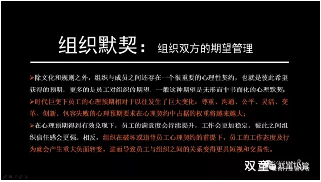 除了文化和規(guī)則之外,組織與成員之間還存在一個(gè)很重要的心理性契約,也就是彼此希望獲得的預(yù)期,更多的是員工對組織的期望。在心理預(yù)期得到有效兌現(xiàn)下,員工的滿意度會(huì)持續(xù)提升,工作會(huì)更加穩(wěn)定,彼此之間組織信任感會(huì)更強(qiáng)。