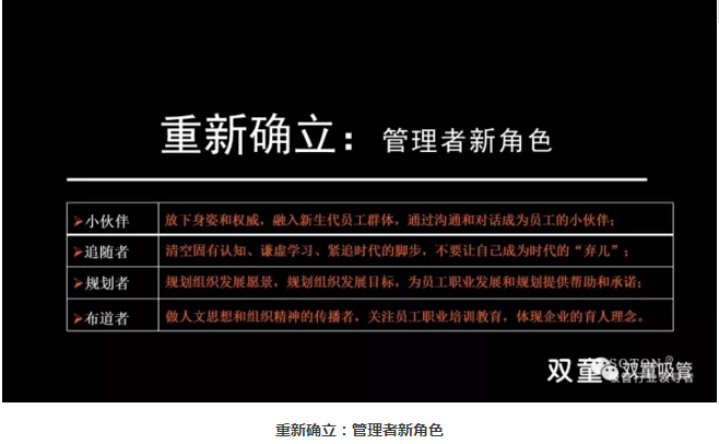 追隨者:管理者應(yīng)清空固有認(rèn)知,謙虛向年輕人學(xué)習(xí),緊追時(shí)代步伐,不要讓自己成為時(shí)代的“棄兒”;