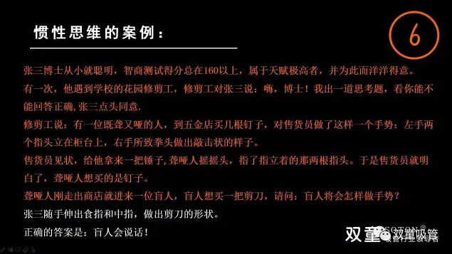 樓仲平通過“盲人買剪刀”及“吵架”兩個小案例和大家分享了認知“慣性思維”:“我們常常會局限于既有的信息或認識的積累,習慣于從固有的角度來觀察、思考事物。這種思維一旦形成就很難打破,并習慣性拒絕接受新事物,久而久之形成固有的思維模式!所以,很多時候限制自己的恰恰是自己的思維定式,我們要跳出自己的思維定式!”