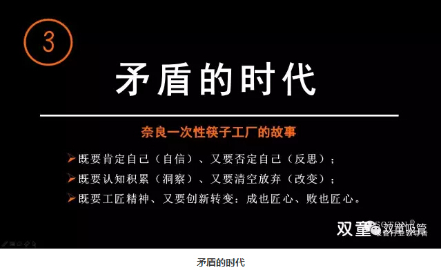 “雙童”樓仲平通過日本奈良一次性筷子的故事告訴大家成也工匠精神、敗也工匠精神,沒有改變,“工匠”精神也沒有用。作為創(chuàng)業(yè)者來講,我們不能用過往的經驗來理解發(fā)生的一切,否則你會被時代所拋棄。在不同的時代,你對時間和技術進步的理解是不一樣的,既要肯定自己、又要否定自己;既要認知積累、又要清空放棄;既要工匠精神、又要創(chuàng)新轉變!
