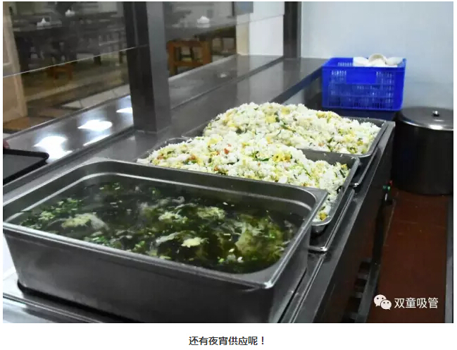 中餐和晚餐就更加豐盛啦,都是三菜一湯的標準。一葷兩素營養(yǎng)搭配,每天都不一樣哦!夜宵則有蛋炒飯、紫菜雞蛋湯、面條…… 晚上11點還有營養(yǎng)的夜宵供應(yīng),員工們進了“雙童”可得胖三斤呀!