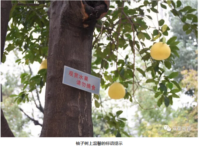 原來,為了“雙童”的生態(tài)和美觀,公司明確柚子是觀賞性水果,每棵柚子樹上都有“觀賞水果,請勿摘食”的字樣,提醒和引導(dǎo)員工不要摘食觀賞水果。