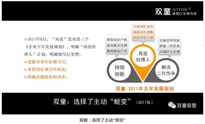 公司創(chuàng)辦初期聘任部分原國營企業(yè)的下崗管理層,這些人客觀上在企業(yè)發(fā)展中做出了巨大的貢獻(xiàn)。但2010年前后,其中的大部分管理層逐漸出現(xiàn)了“認(rèn)知時間軸瓶頸”,他們完全憑經(jīng)驗用老方法解決新問題,拒絕接受和應(yīng)用新興事物,團隊的成長遇到了瓶頸。因此,“雙童”決定重新梳理團隊,在2011年發(fā)布了第三個《企業(yè)五年發(fā)展規(guī)劃》,明確“再造經(jīng)理人”計劃,明確領(lǐng)導(dǎo)層更替:選拔培養(yǎng)年輕領(lǐng)導(dǎo)層、重要崗位領(lǐng)導(dǎo)年輕化、明確實施股份制改革,慢慢解決管理層老化問題!重組后的“雙童”團隊平均年齡不到三十歲,大部分核心團隊的工齡在十年以上,學(xué)歷、知識層次和忠誠度大幅提高!