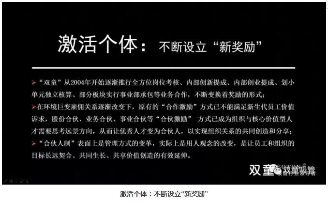 激活組織的同時,“雙童”也在激活個體上絞盡腦汁,不斷設(shè)置“新獎勵”。公司從2004年開始逐漸推行全方位崗位考核、內(nèi)部創(chuàng)新提成、內(nèi)部創(chuàng)業(yè)提成、劃小單元獨立核算、部分板塊實行事業(yè)部承包等業(yè)務(wù)合作,不斷變換著獎勵的形式。同時,股份合伙、業(yè)務(wù)合伙、事業(yè)合伙等“合伙激勵” 方式已成為組織與核心價值型人才需要思考遠(yuǎn)景方向,從而讓優(yōu)秀人才變?yōu)楹匣锶?,以實現(xiàn)組織關(guān)系的共同創(chuàng)造和分享!