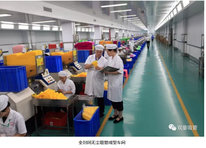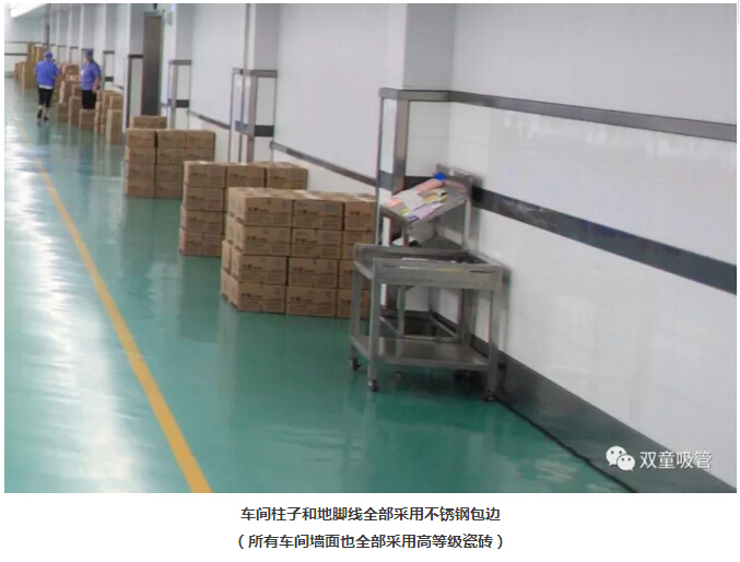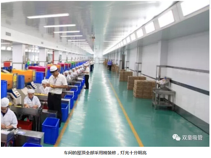 “雙童”車間的每個入口,有著許多安全、衛(wèi)生提示的標(biāo)牌,引導(dǎo)員工門在進入車間時要注意安全和衛(wèi)生防護工作。進入車間內(nèi)部,一列列整齊的機器、一箱箱五顏六色的吸管、一條條清晰分明的分界線,車間內(nèi)全部安裝了恒溫空調(diào),屋頂全部進行精裝修寬敞明亮,柱子和地腳線用不銹鋼進行包邊,大大增加了建筑年限。所有員工皆穿著潔白的工作服,正在忙碌地進行生產(chǎn)工作。