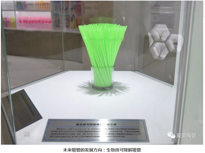 值得關(guān)注的是,博物館中還陳列著“雙童”研發(fā)的聚乳酸可降解吸管。這種吸管由玉米或淀粉乳化而成,在堆肥條件下45天就可以分解為水和二氧化碳,有效地避免了塑料制品所造成的白色污染問題。但由于聚乳酸等可降解材料的原料價(jià)格過于昂貴,客觀上會(huì)受成本過高的限制,過高的產(chǎn)品售價(jià)暫時(shí)還難以被市場和消費(fèi)者大范圍接受。但是,我們堅(jiān)信,這一定是吸管行業(yè)未來發(fā)展和研究的主要方向!