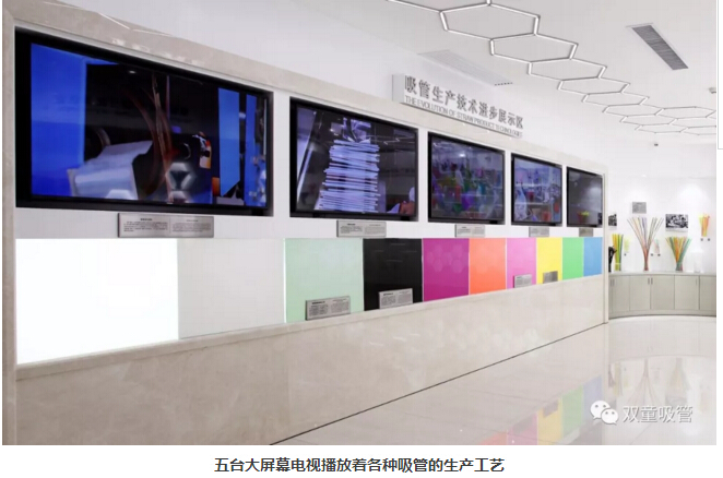由于現(xiàn)代塑料吸管的生產(chǎn)設(shè)備過于龐大,不能一一將設(shè)備陳列在博物館現(xiàn)場。所以在吸管生產(chǎn)技術(shù)展示區(qū)內(nèi)采用了五臺(tái)三星55寸大屏幕電視用于展播各類吸管的生產(chǎn)工藝。每臺(tái)電視機(jī)各播放一種吸管的生產(chǎn)工藝,大家在觀看的過程中能非常直觀的感受到現(xiàn)代吸管的生產(chǎn)技術(shù)和生產(chǎn)工藝。