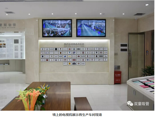 >>> 在“雙童”吸管產(chǎn)品陳列廳的墻面上有兩臺(tái)大屏三星液晶電視連接著車間的監(jiān)控端,讓客戶在不進(jìn)入車間的前提下也能了解到“雙童”的車間生產(chǎn)狀況;