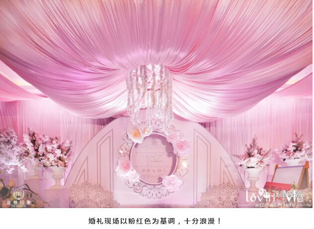 婚禮現(xiàn)場裝飾以粉紅色為基調,非常浪漫。婚宴席開50桌,來賓們共同見證一對新人的幸福時刻!
