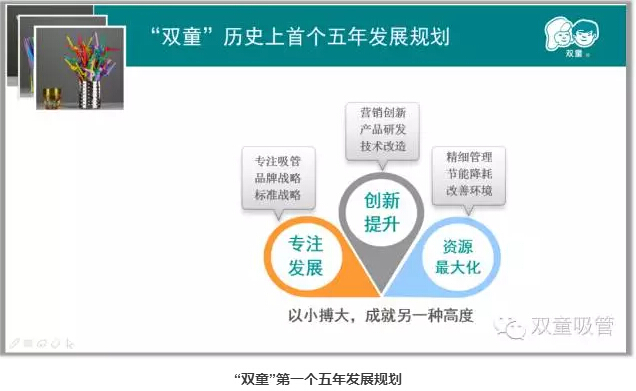 所以,“雙童”在這樣的背景下,提出了“以小博大,成就另一種高度”這句企業(yè)座右銘,來(lái)引領(lǐng)和激勵(lì)企業(yè)的發(fā)展。正是在這句座右銘的引導(dǎo)下,“雙童”摒棄了浮躁,抗拒了誘惑,通過(guò)不斷地努力、進(jìn)取和創(chuàng)新,把一根小小的吸管做到極致,做成了全球吸管領(lǐng)導(dǎo)者!